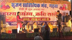 गढ़वा । होली के अवसर पर स्थानीय टाउन हॉल के मैदान में सृजन साहित्यिक मंच द्वारा आयोजित होली हास्य-व्यंग्य कवि सम्मेलन में उड़े व्यंग के गुलाल के बीच जमकर लगे ठहाके। कवियों ने अपनी शानदार रचनाओं से देर रात तक समां बांधा। पंकज प्रखर की राष्ट्रप्रेम की कविताओं तथा संजय चौबे व दयाशंकर तिवारी के होली गीतों ने दर्शकों का मन मोह लिया। कार्यक्रम की शुरुआत मिर्जापुर से आयी कवयित्री पूनम श्रीवास्तव ने मां सरस्वती की वंदना से की। इसके बाद उन्होंने शृंगार रस से परिपूर्ण “जब हुए प्यार के सिलसिले देख ले, मिट गये सारे शिकवे गिले देख ले… तथा भोजपुरी से “आग लागी त कुछ पल लहकबे करी, फूल कौनो रही पर महकबे करी…” सुनाकर खूब तालियां बटोरीं।