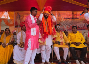देवी धाम के मंच पर मुख्य अतिथि के रूप में पहुंचने नवनिर्वाचित नप अध्यक्ष आशीष कुमार सोनी उर्फ दौलत सोनी को संचालन समिति के अध्यक्ष विजय प्रसाद के द्वारा फूल माला अंग वस्त्र तथा पगड़ी पहनाकर किया गया।